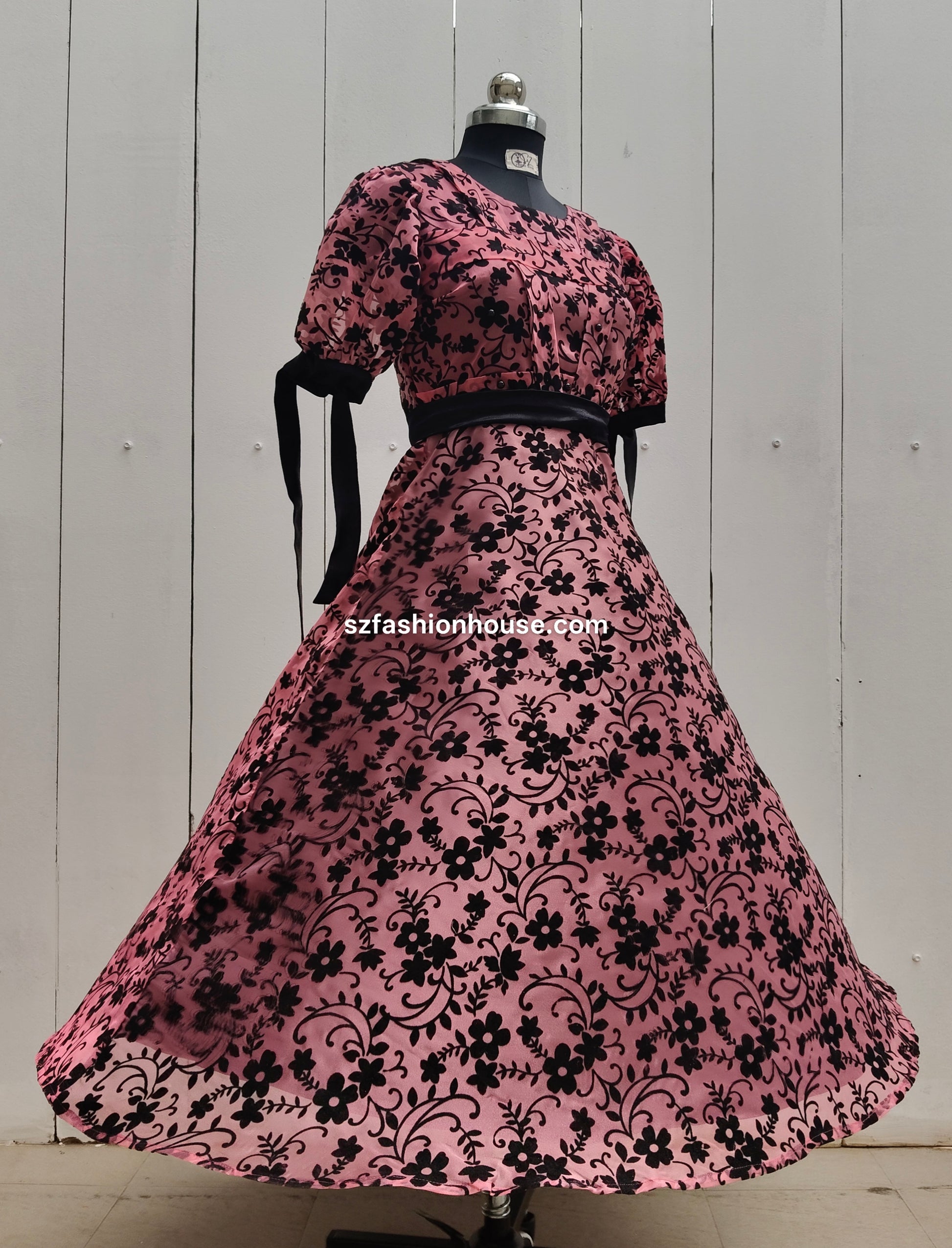 Turn heads with our Wine Floral Designer Gown by S&Z Fashion House. This elegant piece features a rich wine-pink base with bold black velvet floral patterns, puff sleeves, and a chic black waist tie for a flattering fit. Perfect for evening parties, receptions, and special occasions.